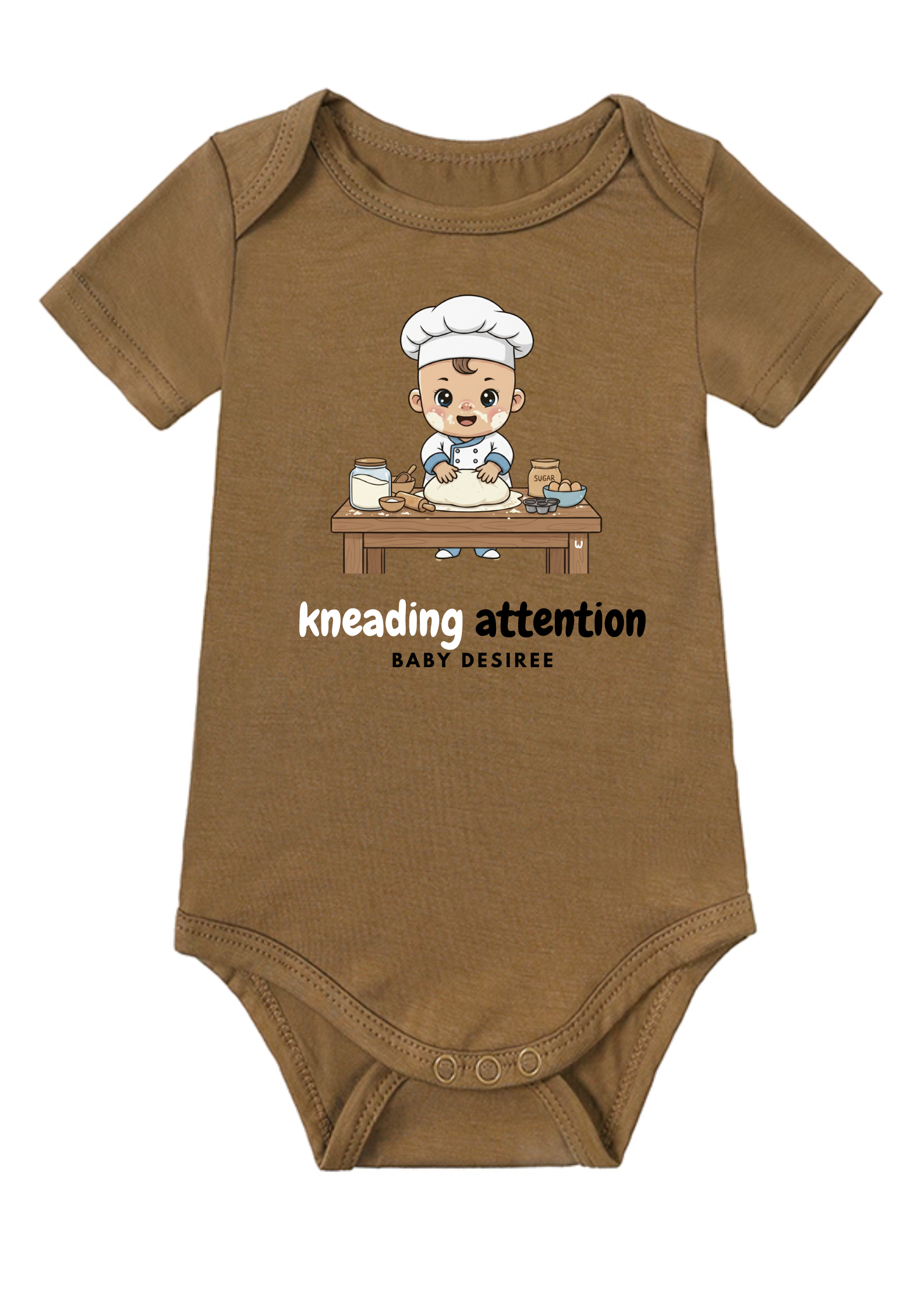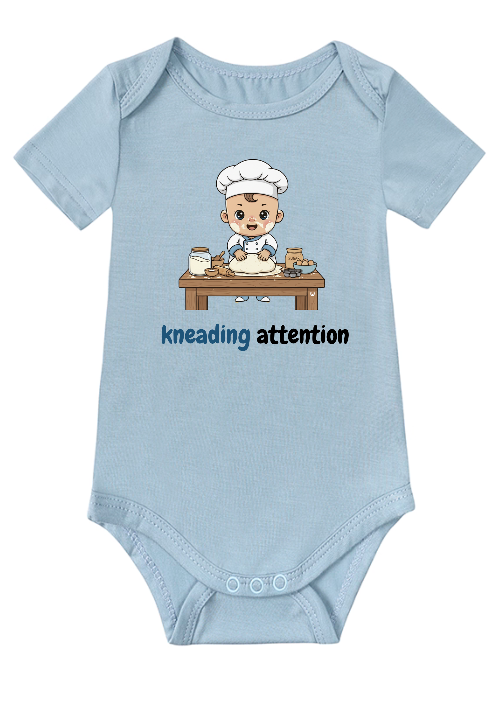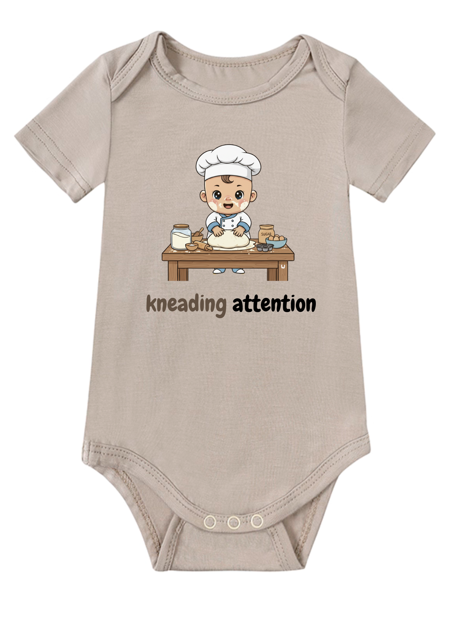Our Baker-in-Training Onesie, a sweet addition to our "Little Dreamers & Big Futures" collection, is ready to rise to the occasion! This adorable onesie features a charming graphic of a mini baker, complete with a tiny apron and chef's hat, ready to knead attention and win hearts. It’s the perfect outfit for your future pastry chef to wear while they're whipping up a storm of cuteness or just kicking back at home.
