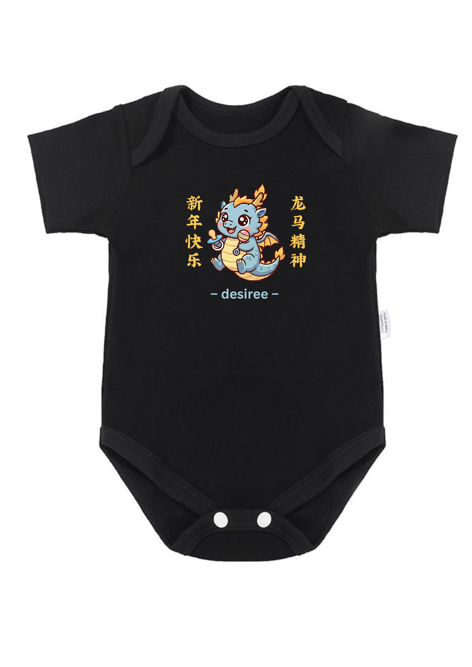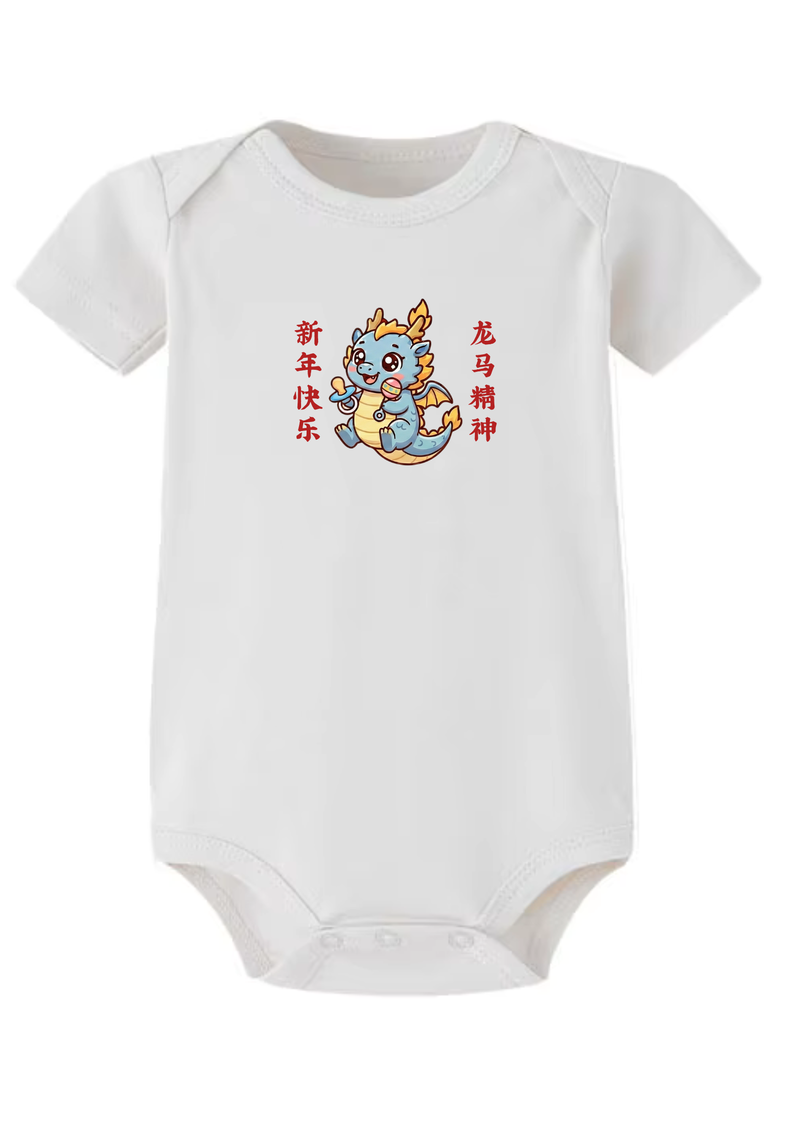 The design features a playful, bright-eyed baby dragon ready to ring in the celebrations with a festive rattle in hand. Flanked by the greetings "Happy New Year" (新年快乐) and the idiom "Long Ma Jing Shen" (Spirit of the Dragon), this outfit is a heartwarming blessing for vigor and happiness in the year ahead. It is the perfect photogenic look for a baby who is full of life and ready to charm the entire family.