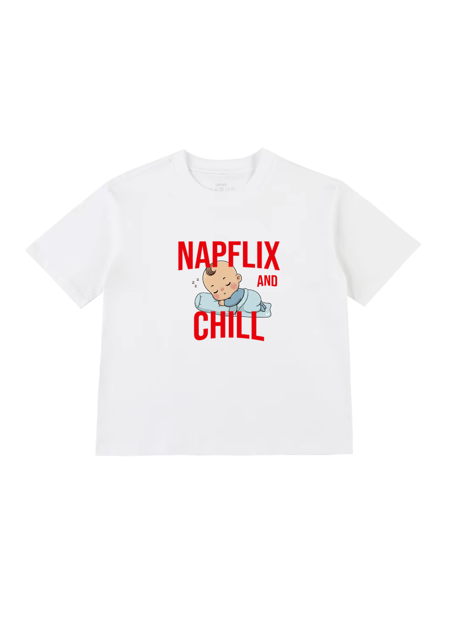 It's time to log off and snooze! This instantly relatable and hilarious design is perfect for the baby whose favorite activity is a long, uninterrupted nap. The graphic features a humorous play on a popular modern phrase, with bold, eye-catching red text that reads "NAPFLIX AND CHILL." At the center, an adorable cartoon baby is shown peacefully asleep, snuggled tightly on a pillow, creating a picture of ultimate relaxation. It's a witty and charming statement piece, making it a perfect gift for new parents who understand the true meaning of baby entertainment.