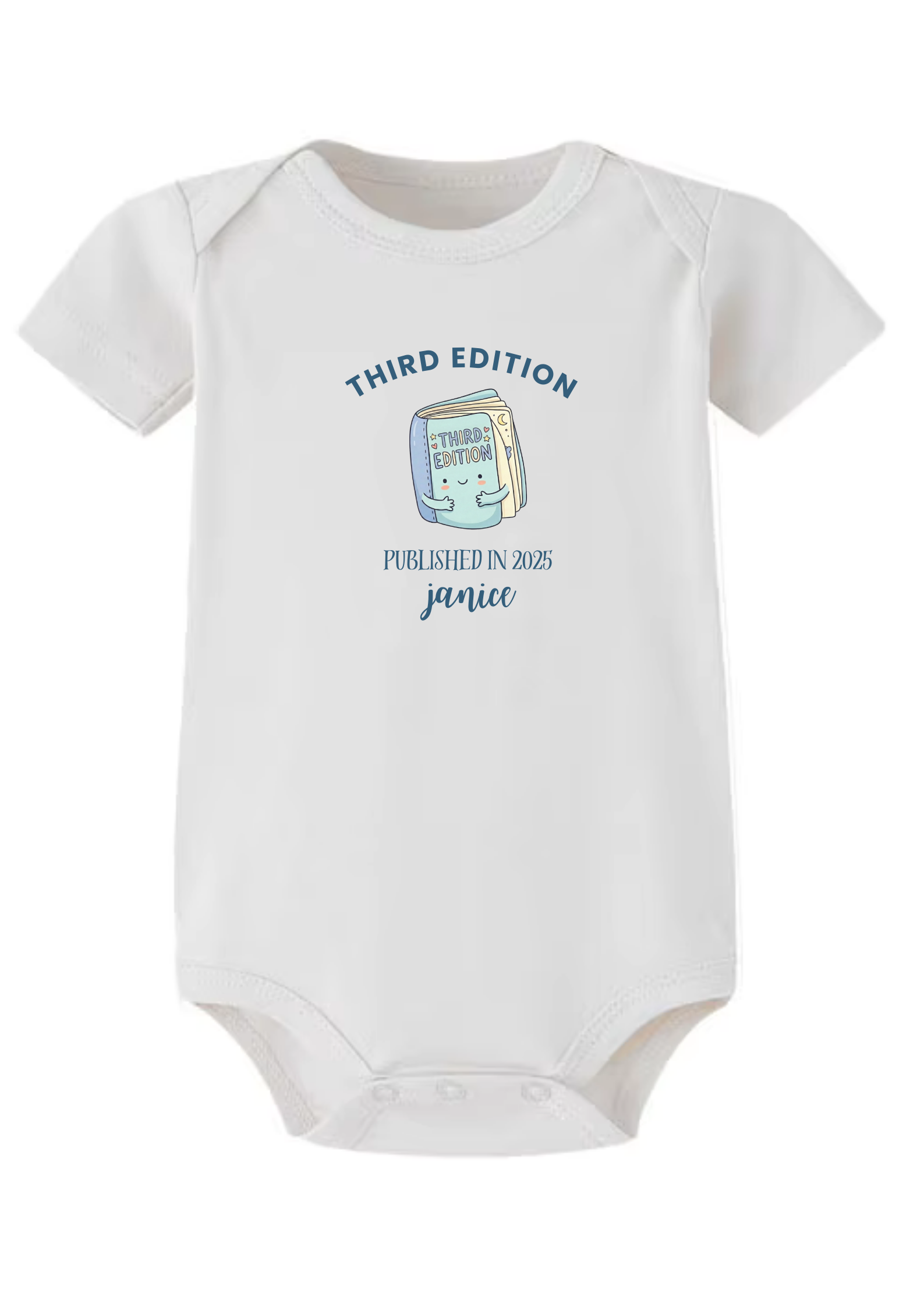Featuring a charming, smiling book illustration, this bodysuit captures the whimsy of childhood stories. It is designed specifically for growing families, allowing you to coordinate siblings in "First Edition," "Second Edition," and "Third Edition" tiers—making for an unforgettable pregnancy announcement photo or a heartwarming matching sibling set.