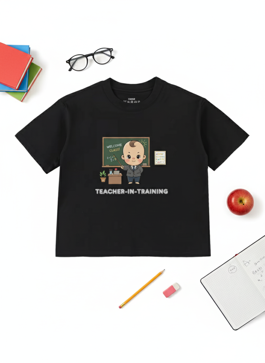 Inspire a love for learning from day one with our Teacher-in-Training T-shirt from the "Little Dreamers & Big Futures" collection. This adorable shirt features a charming graphic of a mini teacher, complete with a tiny chalkboard and pointer, ready to teach the ABCs of cuteness. It’s the perfect outfit for your future educator as they embark on a journey of discovery.