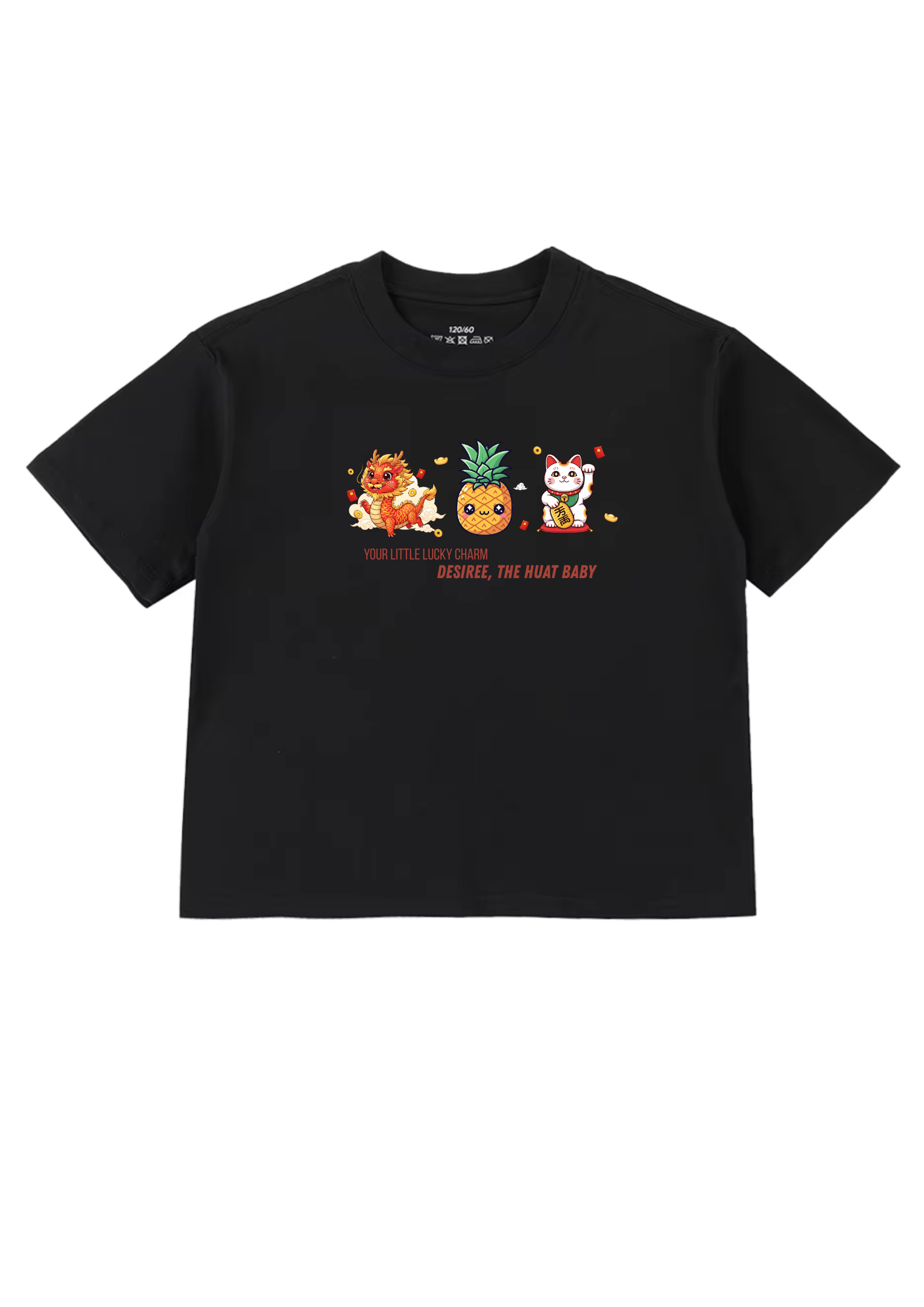 It features three adorable symbols of prosperity: a cheerful fortune cat, a lucky ong lai (pineapple), and a mighty dragon. It's the perfect tee for celebrating special occasions or just bringing good vibes to any day.